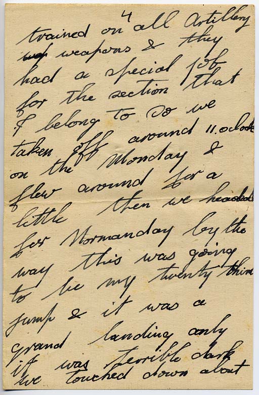 trained on all Artillery weapons & they had a special job for the section that I belong to so we taken off around 11 o’clock on the Monday. I flew around for a little then we headed for Normandy by the way this was going to be my twenty third jump & it was a grand landing only it was terrible dark we touched down