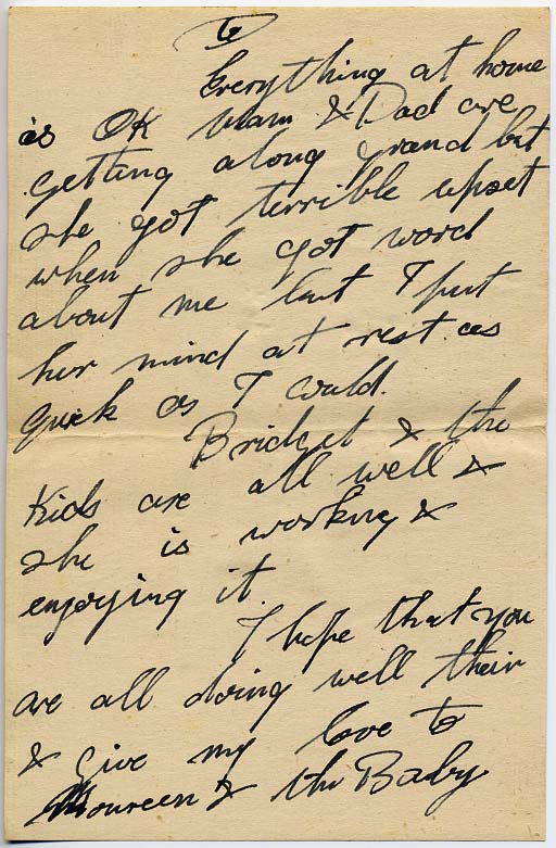 Everything at home is OK Mum & Dad are getting along grand but she got terrible upset when she got word about me but I put her mind at rest as quick as I could.