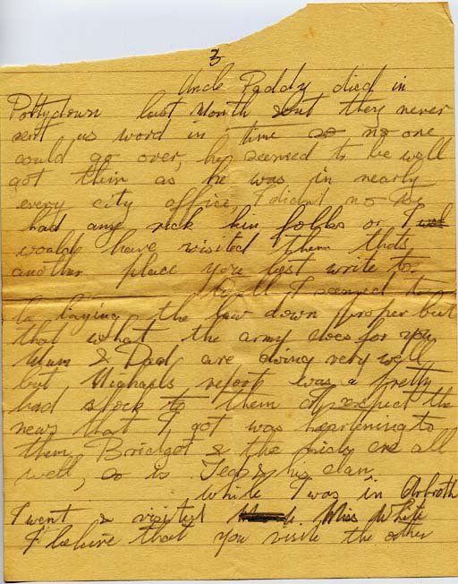 Uncle Paddy died in Pottydown last Month but they never sent us word in time so no one could go over, he seemed to be well got thin as he was in nearly every city office, I didn’t no he had any sick his folks or I would have visited them that’s another place you best write to.