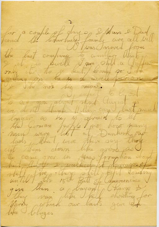 I expect to be out to see you about next August as we don’t think Hitler can last much longer as he is afraid to let his German people no how many men were lost at Dunkirk one lads that were there say they cut them down like grass as they came over in mass formation shout heil Adolf & walked at barrages of shell fire. they still kept coming until the 15th Batt of Camerronines give them a bayontt Charge & they ran like hell shouting for Mercy which our lad’s gave them like blazes.