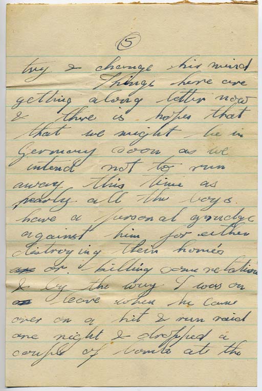 Things here are getting along better now & there is hope that we might be in Germany soon as we intend not to run away this time as nearly all the boys have a personal grudge against him for either destroying their homes or killing some relative & by the way I was on leave when he came over on a hit & run raid one night & dropped a couple of bombs at the