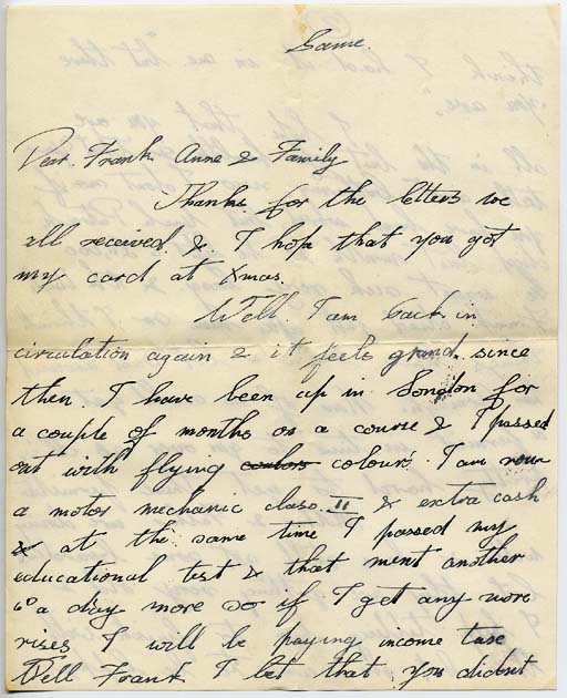 Well I am back in circulation again & it feels grand. Since then I have been up in London for a couple of months on a course & I passed it with flying colours. I am now a motor mechanic class II & extra cash & at the same time I passed my educational test & that ment another 60 a day more so if I get any more rises I will be paying income tax. Well Frank I bet that you didn’t