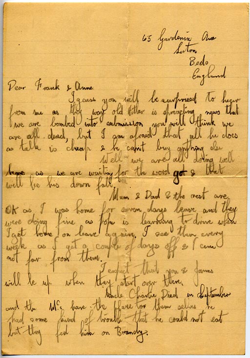 I guess you will be surprised to hear from me as they way old Hitler is spreading news that we are bombed into submission you will think we are all dead, but I am afraid that all he does as talk is cheap and he can’t buy anything else.