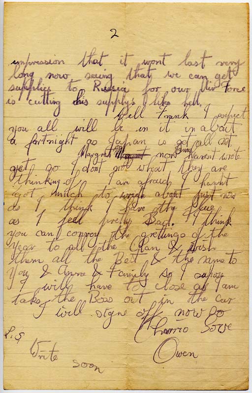 Margaret nor James haven’t wrote yet so I don’t know what they are thinking of I am afraid I haven’t got much to write about just now as I think I have the flue as I feel pretty Bad. I think you can convey the greetings of the Year to all the Clan and wish them all the Best & the same to You and Anne & Family so I suppose I will have to close as I am taking the Boss out in the car.