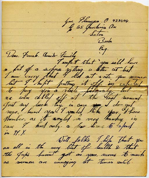 I expect that you will have a bit of a surprise getting a letter at last. I am sorry that I did not write you sooner but I kept putting it off as expected to pay you a visit personally. But we were called off at the last moment Just my luck. Any In case I do get near hand you I would like your Phone Number, as it would be very handy in case I had only a few hours to spend in N.Y.